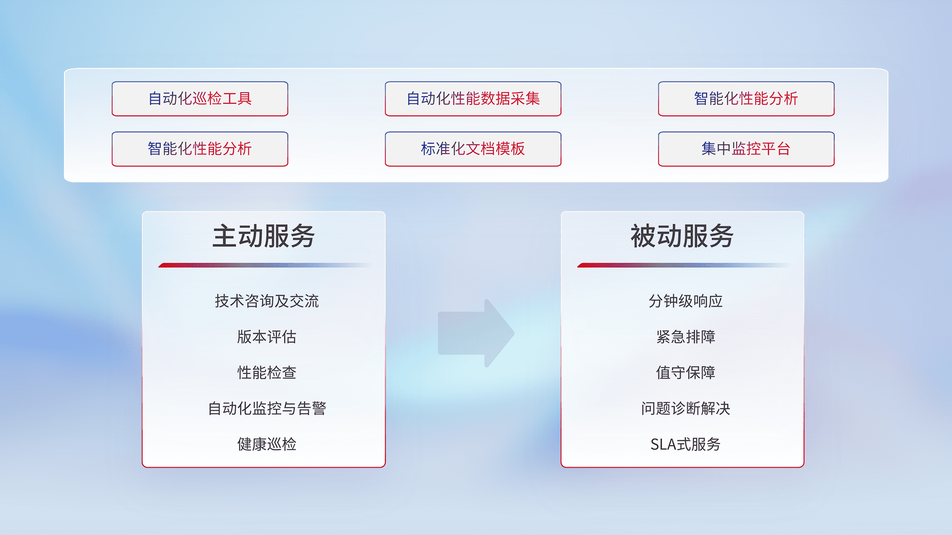 智能化工具和标准化文档,,,,保障服务质量,,,,提供主动服务(包含技术咨询、、、版本评估、、、性能检查、、、自动化监控与告警、、、健康巡检)和被动服务包含(分钟级响应、、、、紧急排障、、、值守保障、、问题诊断解决、、、、SLA服务)。。